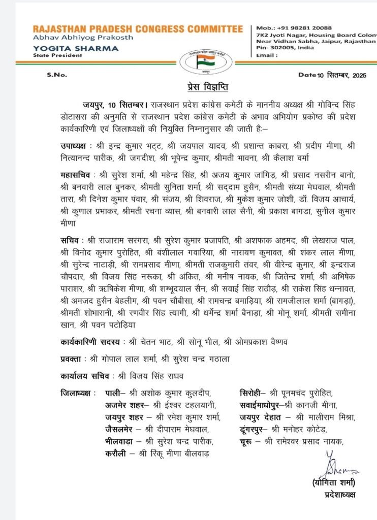 राजस्थान प्रदेश कांग्रेस कमेटी के अध्यक्ष गोविंद सिंह डोटासरा के निर्देश अनुसार प्रकोष्ठ की प्रदेशाध्यक्ष श्रीमती योगिता शर्मा ने आज प्रदेश की कार्यकारिणी की घोषणा की है जयपुर पीसीसी में हुई बैठक के पश्चात पर प्रदेश अध्यक्ष गोविंद सिंह डोटासरा के निर्देशानुसार घोषित प्रदेश कार्यकारिणी में 09 उपाध्यक्ष 19 महासचिव तथा 32 सचिन मनोनीत किए गए हैं।
