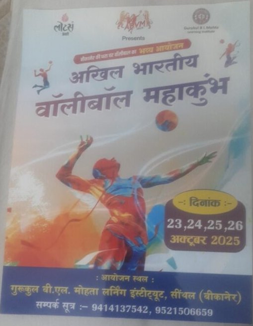 सिंथल(बीकानेर) (23अक्टूबर 25 बीकानेर) बीकानेर की ग्रामीण अंचल में अखिल भारतीय वॉलीबॉल महाकुंभ का आयोजन आगाज गुरुवार दिनांक 23 अक्टूबर से 26 अक्टूबर तक होने जा रहा है यह जानकारी देते हुए मीडिया प्रभारी डॉ.विजय आचार्य ने बताया कि यह प्रतियोगिता दूधिया रोशनी में होंगी जिसमें पूरे देश की करीब 60 टीमों का आमंत्रित किया गया है, वॉलीबॉल का भव्य आयोजन शाम को 6:30 बजे से आरंभ होगा आयोजन समिति अध्यक्ष बाबूलाल मोहता ने बताया कि इस प्रतियोगिता में इसमें स्मेसिंग/ पासिंग महिलाओं व पुरुष, गुजरात प्रदेश की सफेद शूटिंग बॉल अखिल भारतीय माहेश्वरी समाज सफेद शूटिंग बॉल ऑल इंडिया लेदर बॉल शूटिंग कच्ची और पक्की महिला पुरुष साथ ही इंडियन ऑयल रेलवे हरियाणा पंजाब गुजरात राजस्थान की कई जिलों की टीम में भी इस प्रतियोगिता में भाग लेंगे