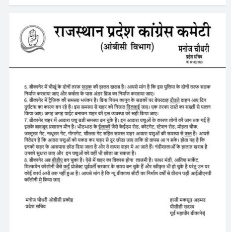 भाजपा सरकार आने के पश्चात बीकानेर शहर 25 वर्ष पीछे चला गया है उन्होंने पत्रकारों को ज्ञापन की प्रति देते हुए कहा कि इन समस्त मांगों को लेकर यदि सरकार ने गंभीरतापुर निर्णय नहीं लिया तो जनता को साथ लेकर जन आंदोलन भी किया जा सकता है