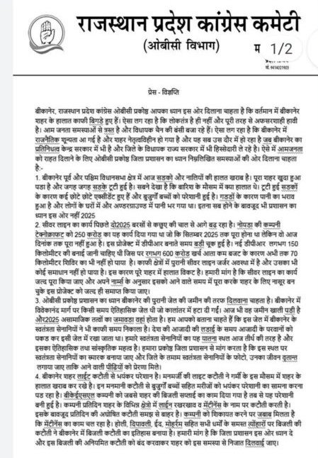 बीकानेर 31अगस्त 2025 राजस्थान प्रदेश ओबीसी विभाग के सचिव मनोज चौधरी और पूर्व महापौर मकसूद अहमद ने आज प्रेसवार्ता कर बीकानेर की मूलभूत समस्याओं को लेकर ज्ञापन के माध्यम से सरकार का ध्यान आकर्षित किया है