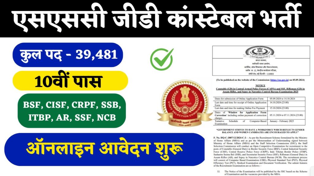 कर्मचारी चयन आयोग (Staff Selection Commission) ने SSC GD की विभिन्न पदों के लिए कुल 39,481 पदों पर भर्ती जारी की है। यदि आप 10वीं पास है तो इस भर्ती के लिए आवेदन कर सकते है। भर्ती से सम्बंधित पूरी जानकारी आपको इस आर्टिकल में मिलेगी।